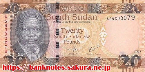表面の肖像は、初代大統領「サルバ・キール Salva Kiir Mayardit (1951- ) 」です。2011年7月9日、南部スーダンは南スーダン共和国として独立し、7月18日から1・5・10・25・50・100ポンドと全部で6種類の新紙幣が発行されました。裏面には二匹の「レイヨウ」が描かれています。