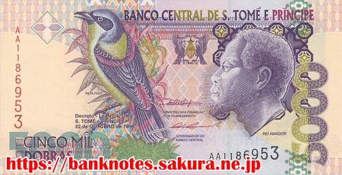 1996年に発行された紙幣です。表面の肖像は「レイ・アマドール Rei. Amador」です。美しい鳥は「 PAPA FIGO 」と書いてあります。裏面には立派な建物が描かれています。