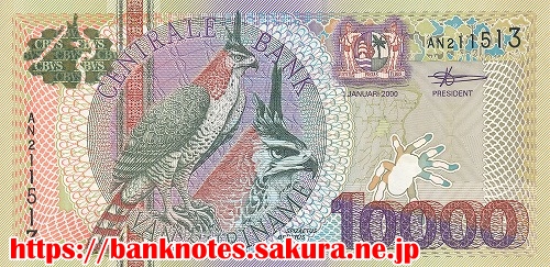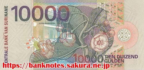 2000年9月より発行された新しい紙幣です。表面には、スリナムに棲息する珍しい鳥類、裏面には、美しい植物の花が描かれています。英国のデラルー社に委託して印刷されているそうです。