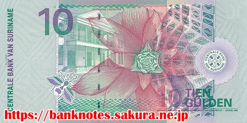 >2000年9月より発行された新しい紙幣です。表面には、スリナムに棲息する珍しい鳥類、裏面には、美しい植物の花が描かれています。英国のデラルー社に委託して印刷されているそうです。