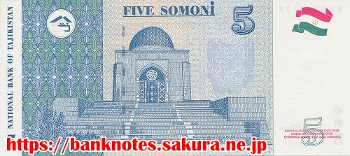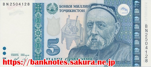 表面の肖像は、作家「サドリディン・アイニー Sadriddin Ayni (1878-1954)」です。裏面には、アブドゥッラー・ルーダキー廟が描かれています。