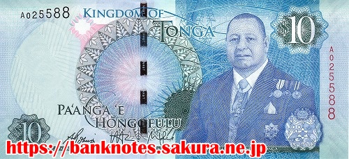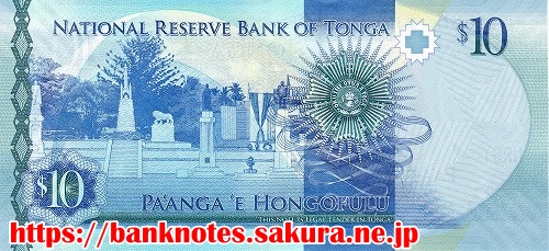 表面の肖像は、国王「トゥポウ6世 Tupou VI (1959- ) 」です。2012年に前国王トゥポウ5世の崩御に伴い王位を継承して現在に至っています。亡くなった前国王の弟にあたります。この紙幣はトゥポウ6世が初めて肖像になった紙幣です。裏面には裏面には「王家の墓 Royal Tombs」が描かれています。ここは王家の墓地で、中央にはジョージ・トゥポウT世やサローテ女王など、王族9人の墓碑が建っています。