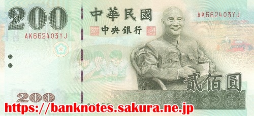 | 2001年に発行された新200圓紙幣です。表面には、にこやかな顔をして椅子に座る「蒋介石 Jiang Jie-shi (1887-1975)」が描かれています。中華民国国府主席(在任1928-1948)・中華民国総統(在任1948-1975)。1948年、憲政下初代大総統(国家元首)に就任したが、翌1949年、内戦に敗北し、台湾へ亡命。以後,1975年の死迄、国民党総裁・中華民国(台湾)総統として同島に君臨し、「大陸反攻」を叫び続けた。裏面は、戦前の日本の「台湾総督府」、現在の「中華民国総統府」の建物です。 |