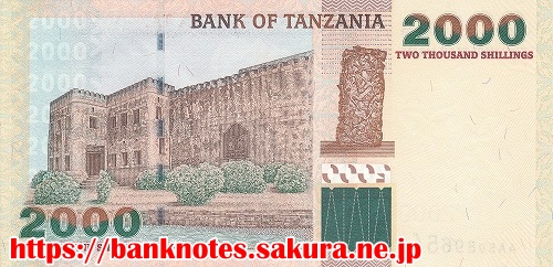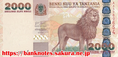 2003年から発行された新シリーズ紙幣です。表面には肖像ではなく、立派なたてがみの「ライオン」が描かれています。裏面に描かれているのは、ザンジバル島のオールドアラブ砦です。