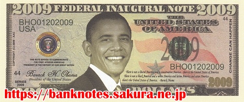 表面は第44代アメリカ合衆国大統領「バラク・フセイン・オバマ Barack Hussein Obama (1961- )」です。2009年の大統領就任時の肖像画だと思われます。同2009年にはノーベル平和賞も受賞しています。