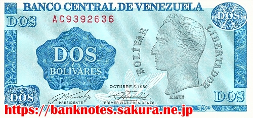 1989年に発行された2ボリバル紙幣です。