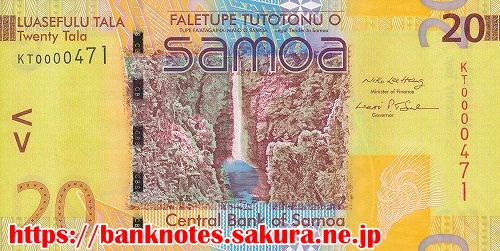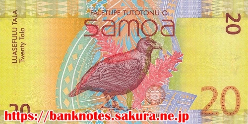 表面には、サモア最大の滝「パパパパイタイ滝 Papapapaitai Falls」が描かれています。ジャングルの中にあり落差は100mもあるそうです。裏面には、これも立派な鳥が描かれています。