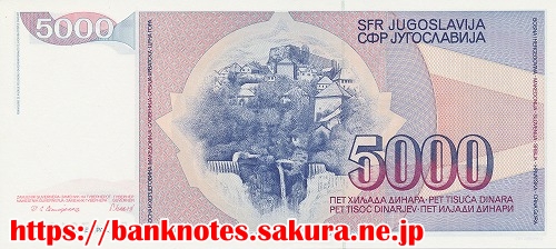 1985年に発行された旧ユーゴスラビア時代の5000ディナール紙幣です。表面の肖像は「チトー前大統領 Josip Broz Tito (1892-1980)」です。