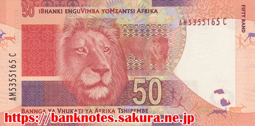 | 2012年11月から流通が始まった、新デザインの50ランド紙幣です。表面の肖像は、元大統領でノーベル平和賞受賞者「ネルソン・マンデラ Nelson Mandela (1918-2013)」です。マディーバの愛称で親しまれ、多くの国民から敬愛されています。国連は2009年、彼の誕生日である7月18日をその功績を称え「ネルソン・マンデラ国際デー」と定めています。2013年12月世界中の人に惜しまれ、95年の生涯を終えました。裏面は、従前どおり『ライオン』が描かれています。 |