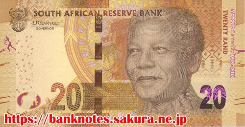 | 故ネルソン・マンデラ氏の生誕100周年を記念して発行された紙幣です。国家反逆罪で終身刑の判決を受け、27年間にわたる投獄生活を送り、その後大統領を務め1993年にアパルトヘイトを撤廃したデクラークとともにノーベル平和賞を受賞しています。2013年に95歳で波乱に満ちた生涯を終えています。2018年が彼の生誕100周年になります。裏面には、マンデラ氏が住んでいた旧黒人居住区ソウェト(Soweto)のマンデラ・ハウスが描かれています。彼はここで反アパルトヘイトの政治活動家として目覚めていきました。 |