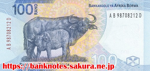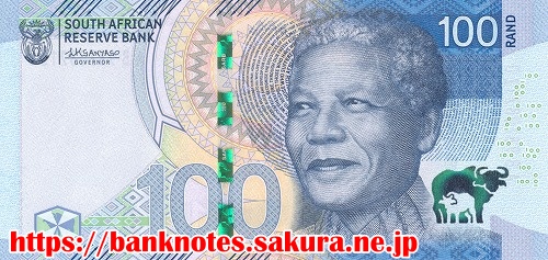 | 2023年5月から流通が始まった、新デザインの100ランド紙幣です。表面の肖像は、元大統領でノーベル平和賞受賞者「ネルソン・マンデラ Nelson Mandela (1918-2013)」です。マディーバの愛称で親しまれ、多くの国民から敬愛されています。国連は2009年、彼の誕生日である7月18日をその功績を称え「ネルソン・マンデラ国際デー」と定めています。2013年12月世界中の人に惜しまれ、95年の生涯を終えました。裏面は、従前どおり『バッファロー』が描かれています。 |