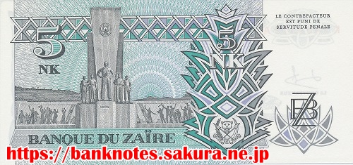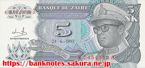 表面の肖像は「モブツ大統領 Mobutu Sese Seko (1930-1997)」です。1997年5月軍事クーデターにより国外に追われ、カビラ大統領率いる現コンゴ民主共和国となっています。モブツ大統領は、9月7日に亡命先のモロッコで死亡しています。