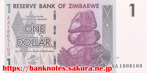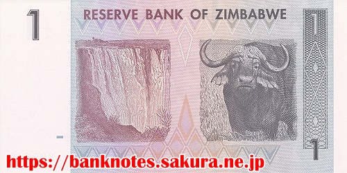 パイパーインフレの対策として、2006年8月1日からゼロを3個とるデノミを実施しました。これにより1000ジンバブエドルが、新しい1ジンバブエドルになりました。紙幣表面には、やはり『バランシング・ロック』が描かれています。裏面には、ビクトリア大瀑布とバッファローが描かれています。